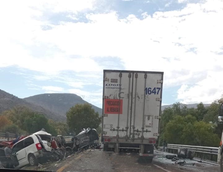 SANTA MARÍA DEL RÍO. – Perdieron la vida dos personas, madre e hija, la primera se llamaba Betzabé, cuando un camión de carga, blanco, el cual se desplazaba sobre la carretera 57 se impactó contra varias unidades y las proyectó contra la guarnición de un puente y cayó para terminar impactado contra el soporte del otro carril, quedó totalmente destrozada la cabina y el motor.