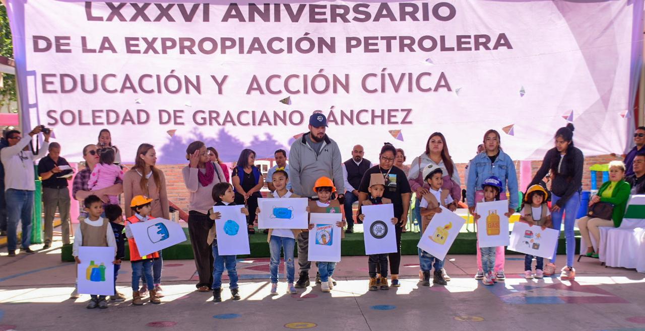 Con la finalidad de incentivar el patriotismo entre la niñez y forjar su educación integral, este martes, el Gobierno Municipal de Soledad de Graciano Sánchez celebró un acto cívico en el Jardín de Niños “María del Carmen Licona” en la colonia Villa de Cactus, para conmemorar el 86 aniversario de la Expropiación Petrolera.