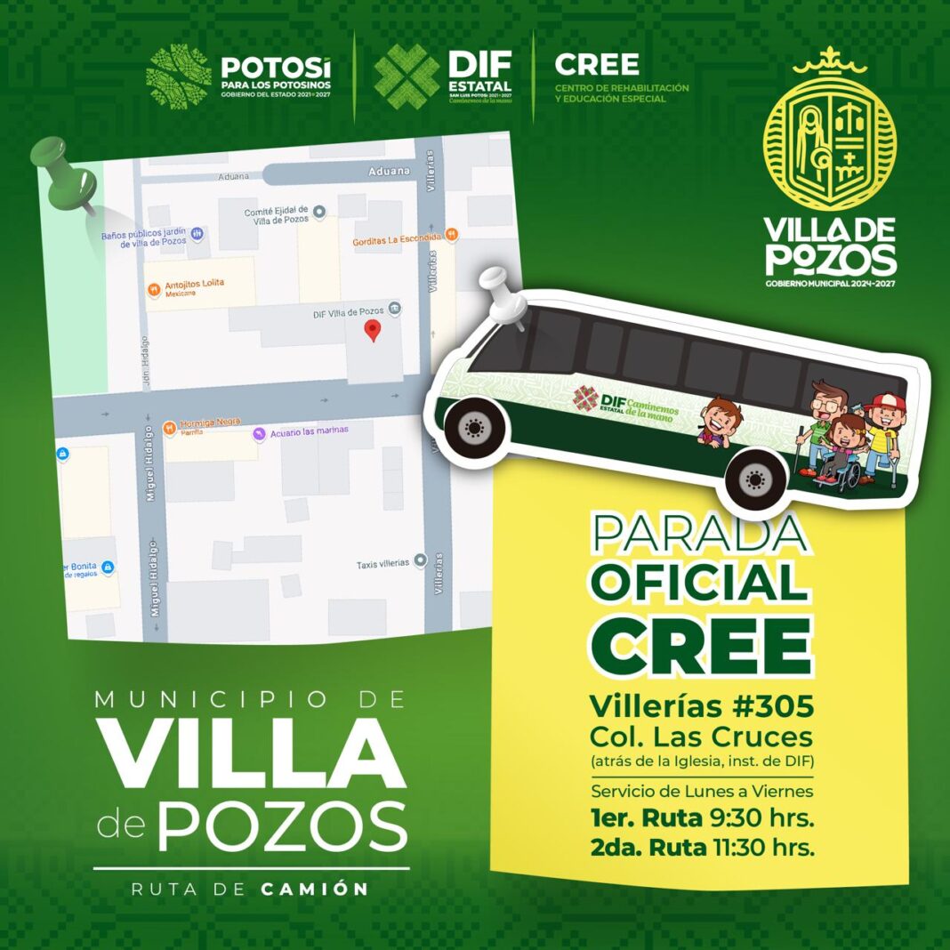 En un esfuerzo por garantizar el acceso a los servicios del Centro de Rehabilitación y Educación Especial (CREE), el Concejo Municipal de Villa de Pozos en coordinación con el DIF Estatal, implementa el programa Parada Oficial CREE para el traslado de pacientes del municipio al CREE, a partir del miércoles 22 de enero.