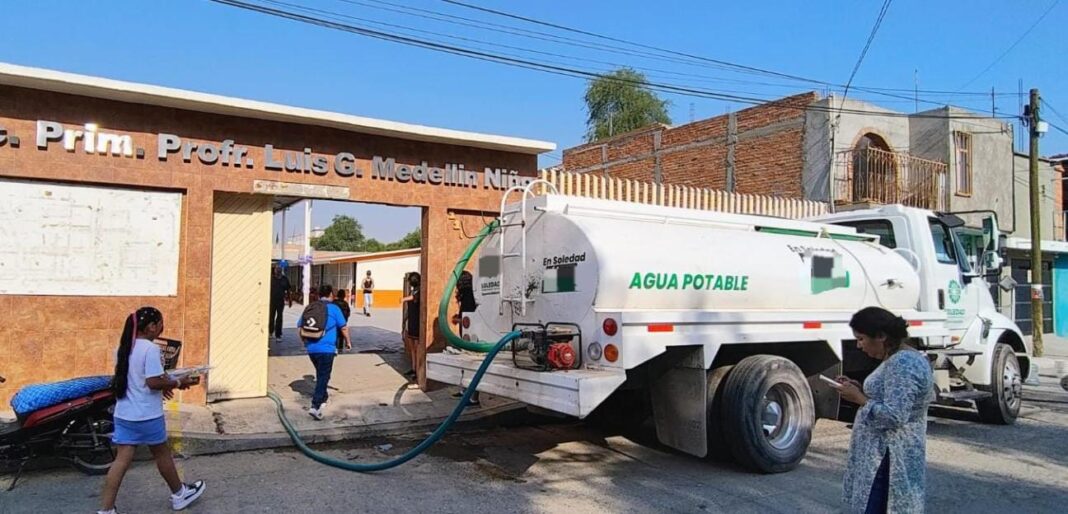 Ante la persistente escasez de agua en el municipio, el Gobierno de Soledad de Graciano Sánchez refuerza el suministro gratuito del vital líquido a escuelas de nivel básico, con el objetivo de garantizar condiciones adecuadas para los estudiantes.
