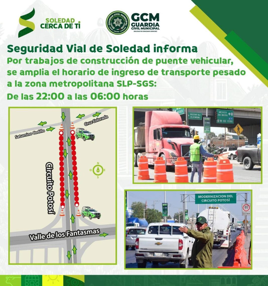 Con el objetivo de mejorar la circulación y reducir las afectaciones durante las obras del puente elevado en Circuito Potosí y Bulevar Valle de Los Fantasmas, la Dirección de Seguridad Vial de Soledad ha decidido ampliar el horario permitido para el transporte de carga en la zona. Esta medida, que es de carácter temporal, establece que los camiones podrán circular por la Zona Metropolitana entre las 22:00 y las 06:00 horas, lo que permitirá una mayor fluidez vehicular durante los trabajos de infraestructura.