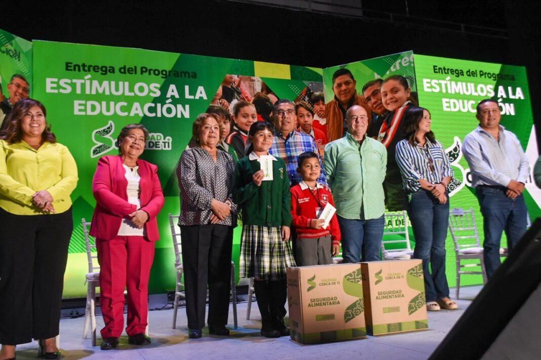 Durante el evento, se beneficiaron 1,500 alumnas y alumnos de escuelas públicas del municipio, tanto de primaria como de secundaria, quienes recibieron un estímulo bimestral de mil 500 pesos en efectivo, así como una despensa alimentaria, como reconocimiento a su esfuerzo y dedicación en el aula.