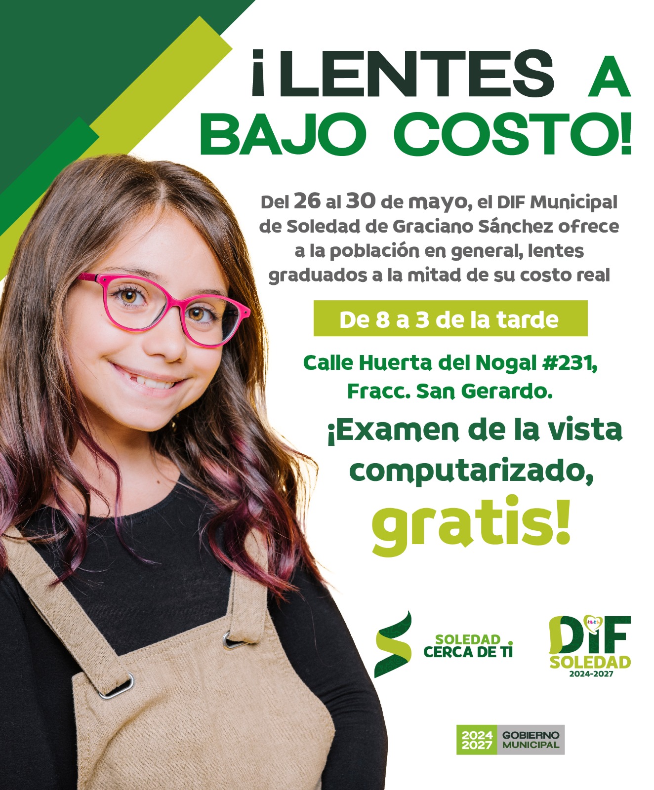 El Sistema Municipal DIF de Soledad de Graciano Sánchez llevará a cabo una campaña de lentes graduados a bajo costo del 26 al 30 de mayo, con el objetivo de facilitar el acceso a servicios de salud visual para la población.