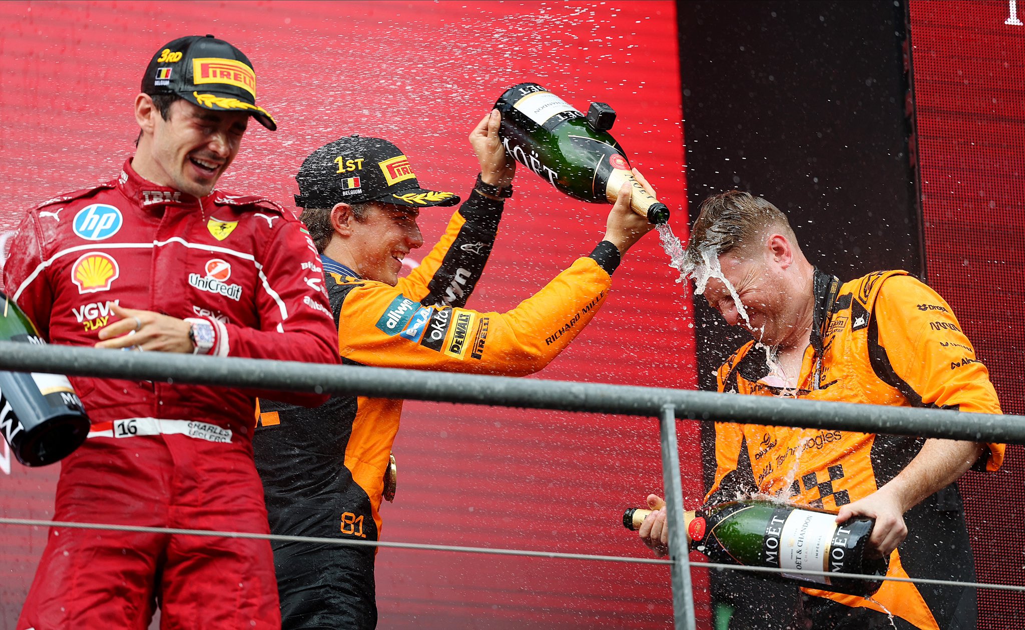Piastri adelantó a su compañero Lando Norris en Eau Rouge tan pronto comenzó la carrera, y mantuvo la ventaja sobre los 44 giros pese a la presión. Norris terminó a 3.415 segundos, completando un doblete para McLaren en esta fecha del Mundial.