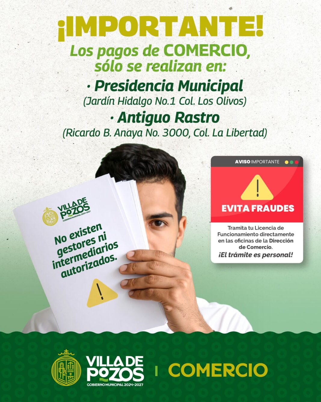 El Gobierno Municipal de Villa de Pozos emitió una advertencia a los comerciantes locales para que no se dejen engañar por personas que, de manera ilegal, se hacen pasar por inspectores o intermediarios con el fin de cobrar por el refrendo de licencias comerciales. Estas personas suelen solicitar pagos en efectivo, por transferencia o incluso directamente a domicilio.