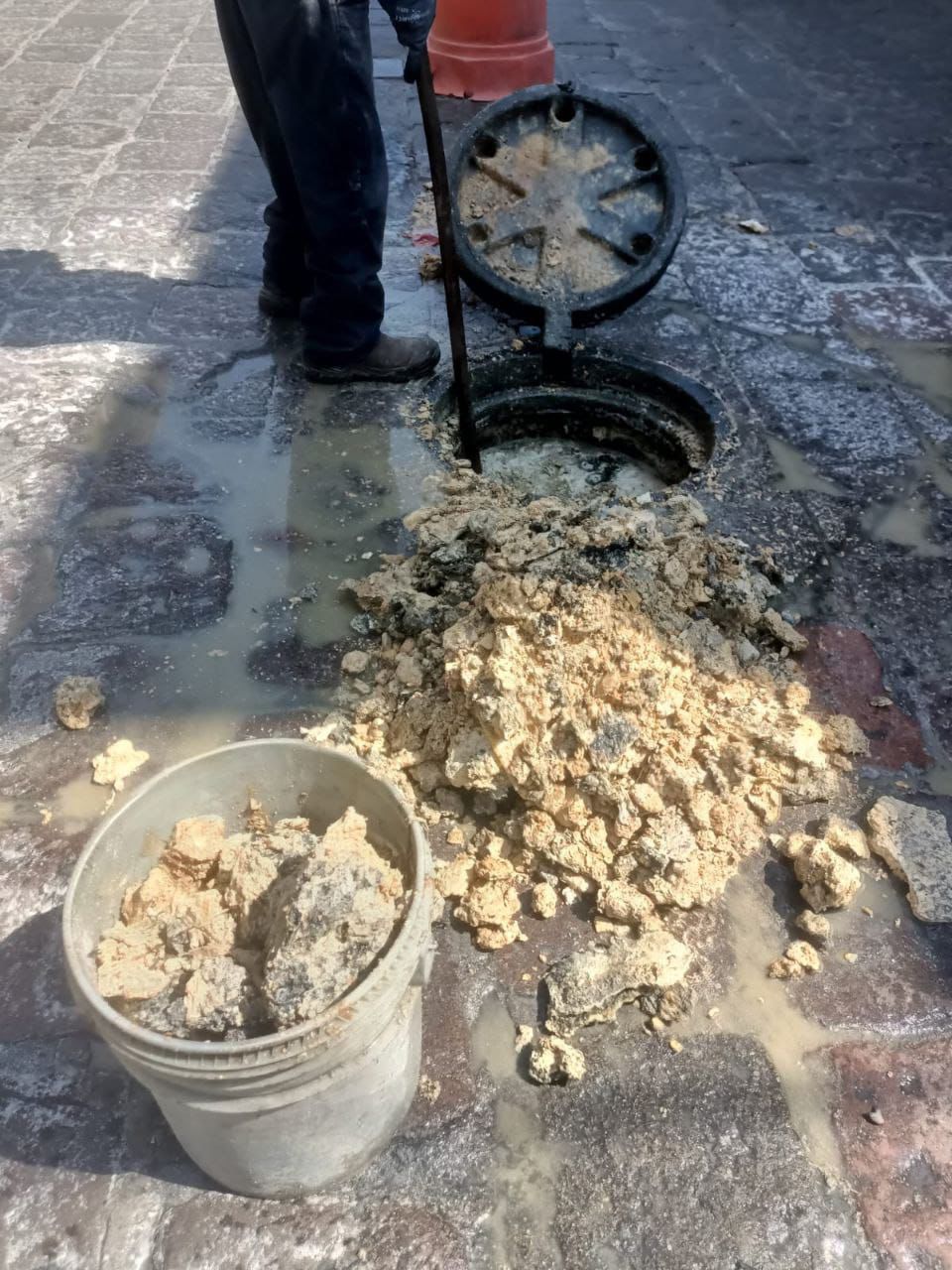En la intervención se limpiaron 90 metros de tubería a través de dos pozos de visita, de los cuales se extrajeron aproximadamente 150 kilos de grasa acumulada que obstruía el flujo del agua residual y provocaba taponamientos y brotes en la vía pública.