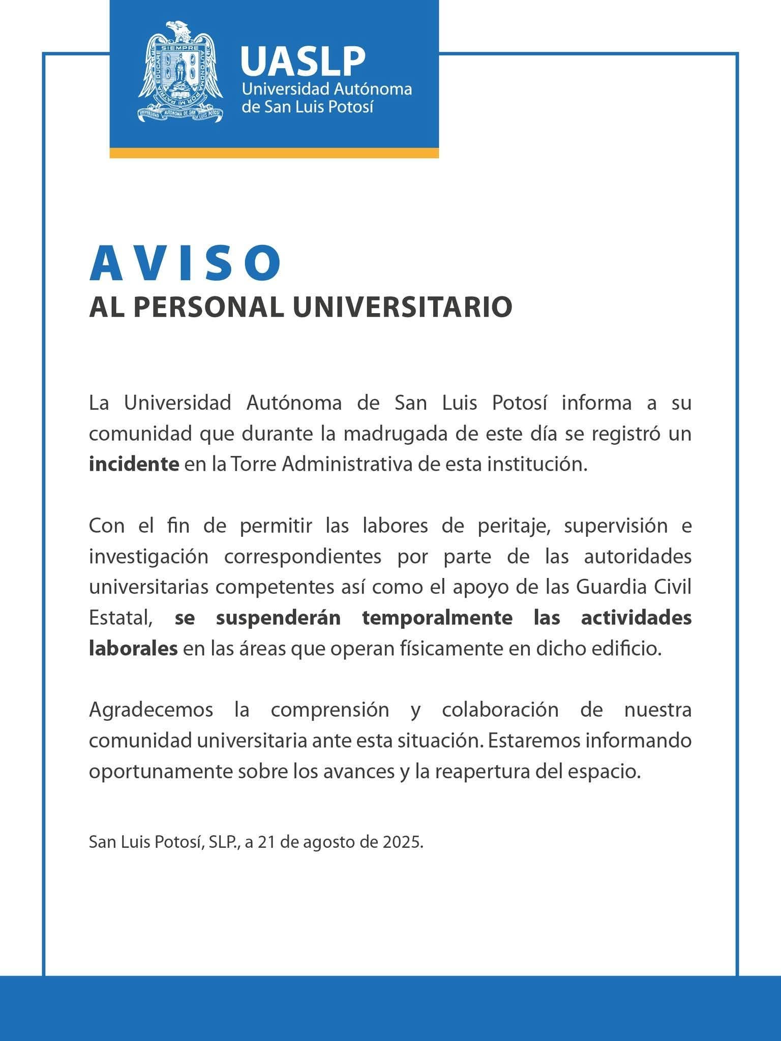 Mediante un comunicado oficial, se informó el cierre de la Torre Administrativa de la Universidad Autónoma de San Luis Potosí (UASLP), esto, debido a que se registró un incidente al interior del inmueble, pero aún se desconocen los pormenores.