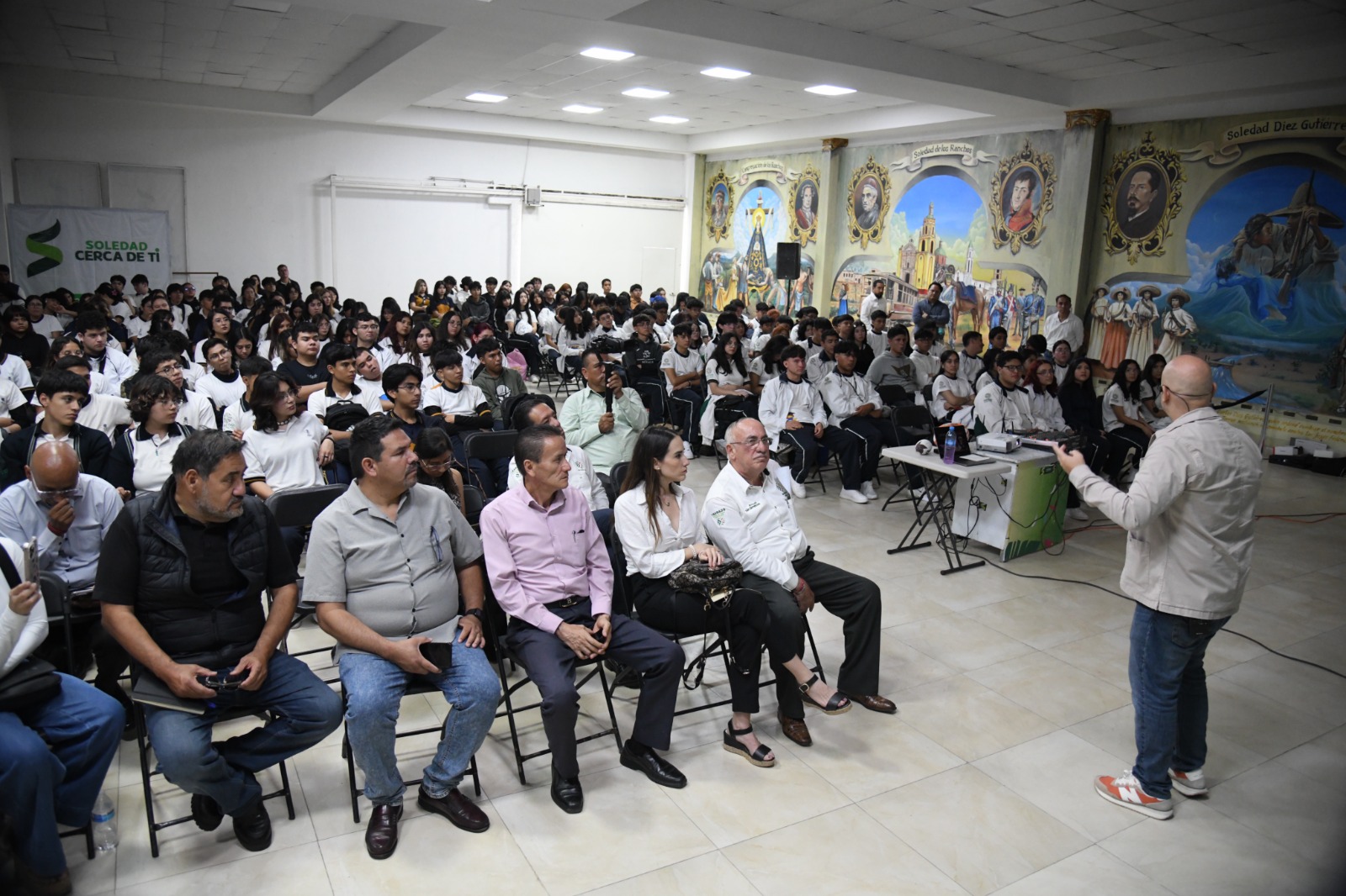 El Ayuntamiento de Soledad de Graciano Sánchez organizó una conferencia magistral dirigida a estudiantes de nivel medio superior, impartida por el motivador personal y coach internacional Rubén Duque, como parte de las actividades de la Feria Nacional del Empleo para las Juventudes 2025.