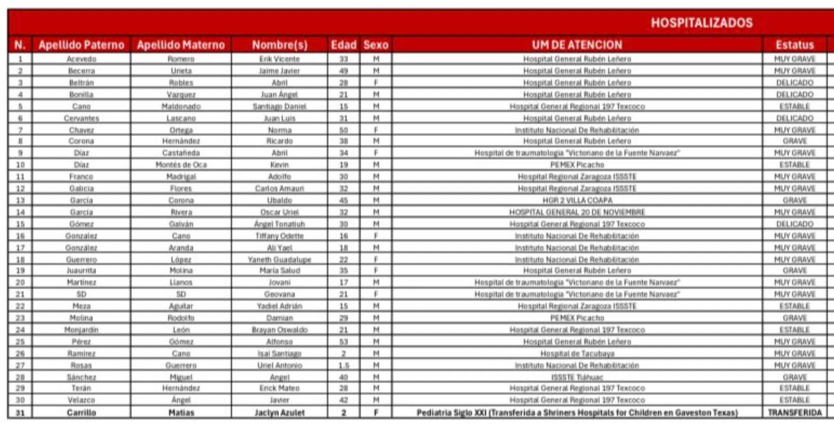 Según la información publicada por la Sedesa, se reporta como muy grave el estado de salud de los menores identificados como Uriel Antonio e Isai Santiago. Pero la autoridad no ha reportado a profundidad los detalles de salud de los niños, solamente se ha informado el traslado de una fémina de dos años de edad a un hospital de especialidades en Estados Unidos de América.