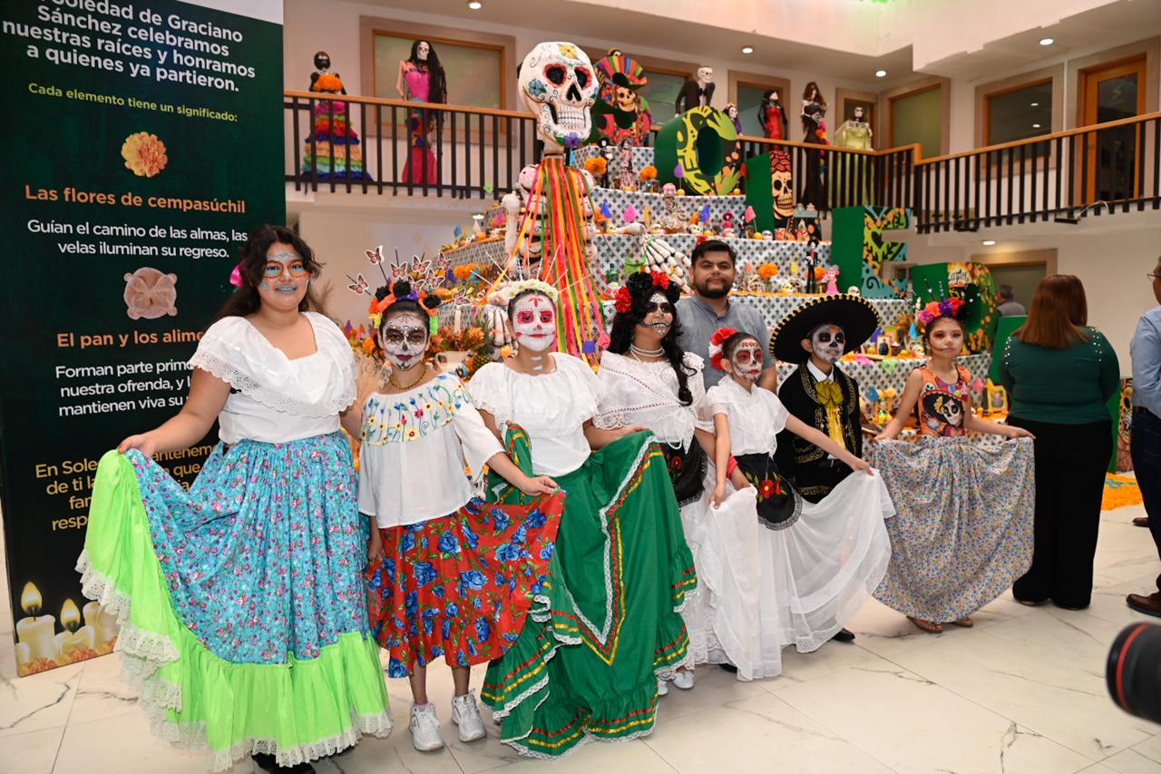 Con gran entusiasmo, el primer Coro Infantil de la Escuela Municipal de Música de Soledad de Graciano Sánchez engalanó la inauguración del Altar de Muertos Monumental instalado en la Presidencia Municipal, con interpretaciones llenas de emoción y talento. Las niñas y niños, caracterizados como catrinas y catrines, deleitaron al público con los temas “Recuérdame”, “Un Poco Loco” y “El Mundo es mi Familia”, recibiendo el reconocimiento y aplausos de los asistentes.