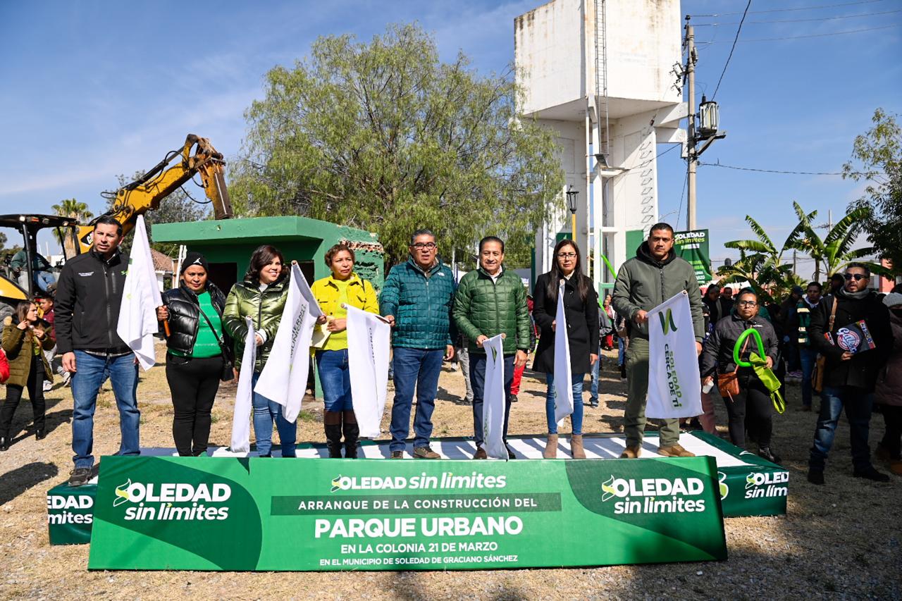 El Ayuntamiento de Soledad de Graciano Sánchez dio inicio a la construcción de un parque urbano en la colonia 21 de Marzo, proyecto que busca recuperar un espacio previamente abandonado y transformarlo en un área de uso comunitario para familias, jóvenes, niñas, niños y personas adultas mayores del sector.