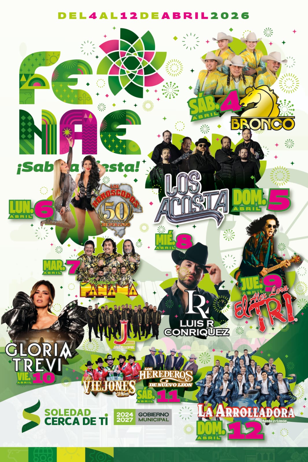 ¡Gloria Trevi, Luis R Conriquez, Bronco, La Arrolladora Banda El Limón, Los Acosta, El Tri y Los Herederos de Nuevo León, darán noches memorables en el centro de Soledad de Graciano Sánchez!