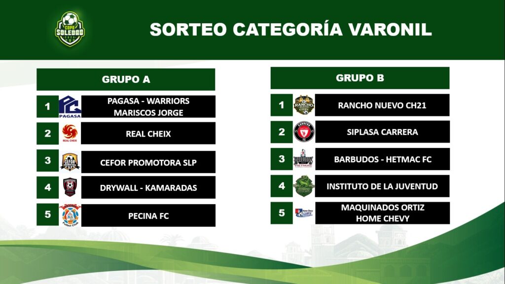 En la rama varonil, al Grupo A se encuentra encabezado por Pagasa-Warriors-Mariscos Jorge, acompañado por Real Chiex, CEFOR Promotora San Luis Potosí, DryWall-Kamaradas y Pecina FC; mientras que el Grupo 2 lo encabeza el subcampeón de la Copa Soledad 2025: Rancho Nuevo CH21, seguido por Siplasa Carrera, Barbudos-Hetmac FC, Instituto de la Juventud y Maquinados Ortiz-Home Chevey.