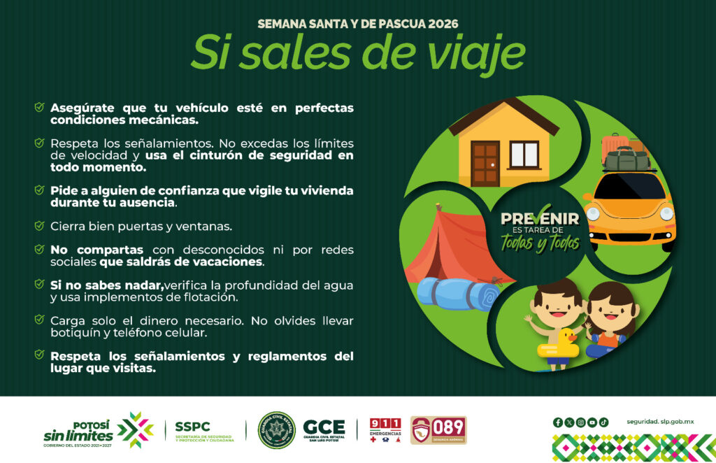 Entre las recomendaciones destacan asegurar puertas y ventanas al salir de casa, evitar dejar llaves en exteriores y pedir apoyo a familiares o vecinos para vigilar la vivienda. Asimismo, se exhorta a no compartir en redes sociales información sobre ausencias, revisar las condiciones mecánicas del vehículo antes de viajar, respetar los límites de velocidad y hacer uso responsable de las líneas 911 y 089.
