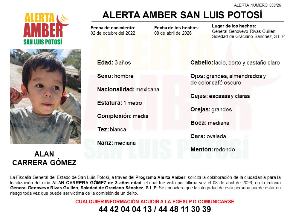 De acuerdo con el testimonio de la madre, el pasado 8 de abril Alan estaba en un domicilio de la colonia General Genovevo Rivas Guillén, en Soledad de Graciano Sánchez, estaba siendo cuidado por su abuela cuando su propio padre entro a la casa, y a la fuerza se llevó al pequeño sin un rumbo conocido. ingresó al inmueble y, mediante el uso de la fuerza, se llevó al menor con rumbo desconocido.