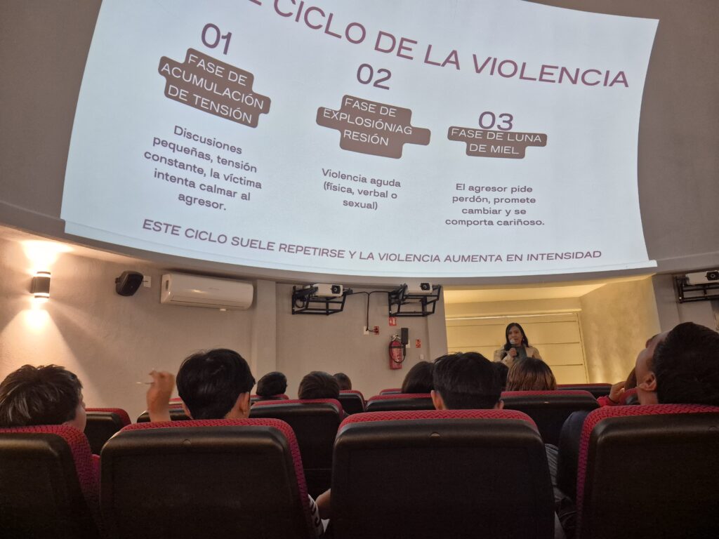Durante su intervención, la ponente invitó a las personas participantes a cuestionar los conceptos de amor y noviazgo, así como a identificar qué se entiende por violencia en las relaciones afectivas. A partir de este ejercicio, se abordaron los distintos tipos de violencia que pueden presentarse, visibilizando conductas que en muchos casos son normalizadas.